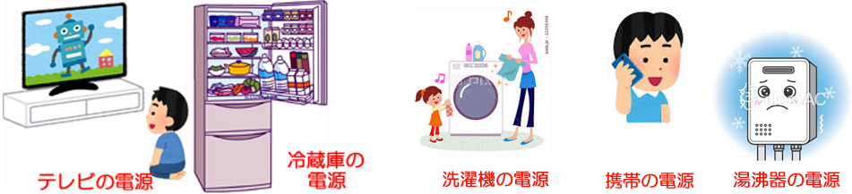 電気を使う物としてはテレビ、冷蔵庫、洗濯機、スマホの充電、そして